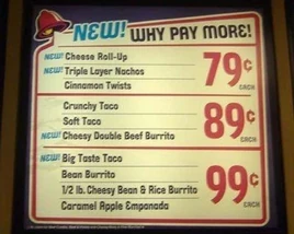 The Why Pay More!? Value Menu was a Taco Bell menu that was introduced in May 2008, with the aim of offering customers a selection of items at a reduced price. This menu consists of various items, including burritos, tacos, and nachos, which are available at prices ranging from 79¢, 89¢, and 99¢.